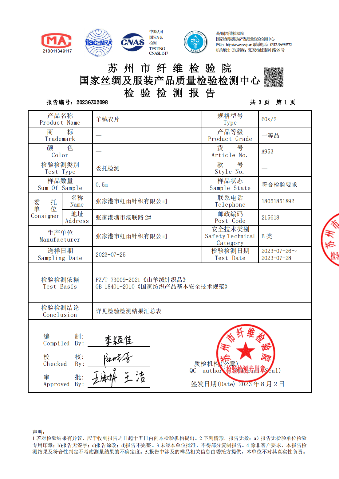 张家港市虹雨针织有限公司获天然纤维证明商标纯山羊绒产品认证